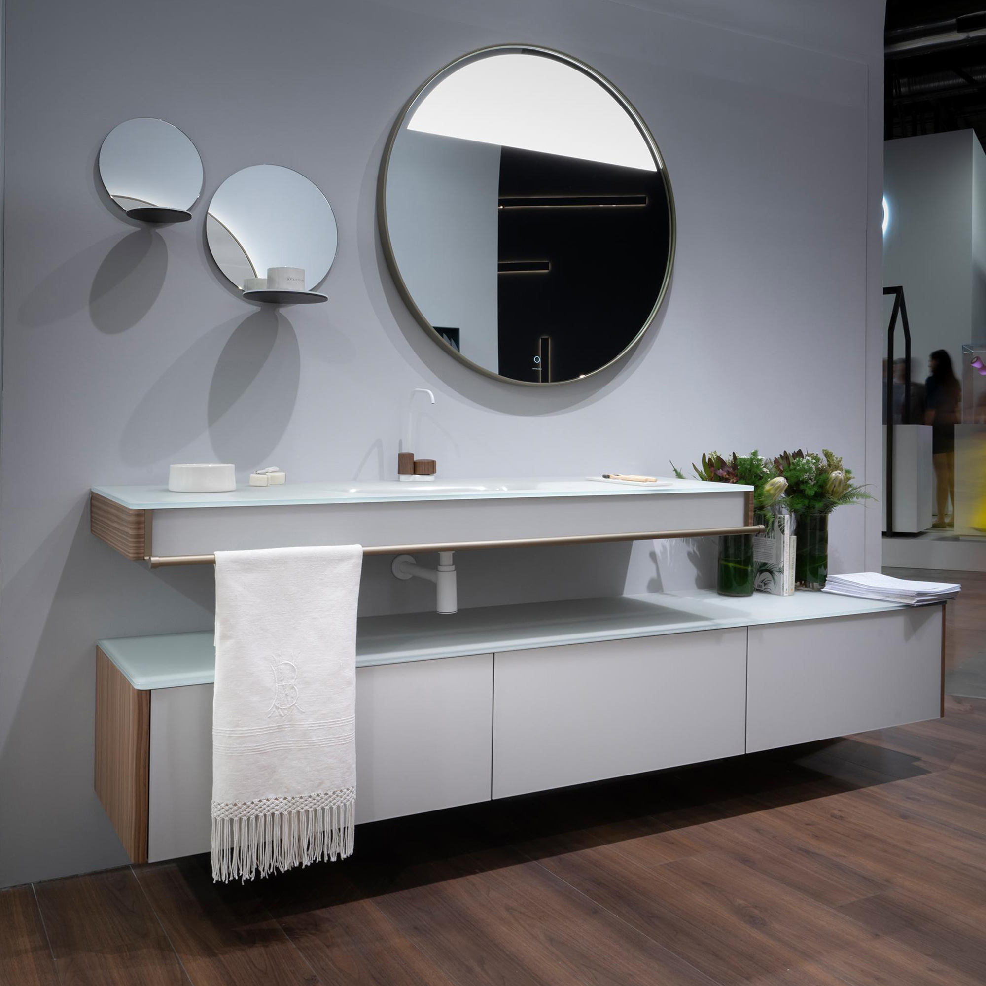 La collection SATELLITE illustre parfaitement comment le style rencontre la praticité, avec un miroir circulaire moderne associé à une étagère en verre, créant une véritable vitrine à la fois confortable, raffinée et idéale pour une salle de bains haut de gamme.